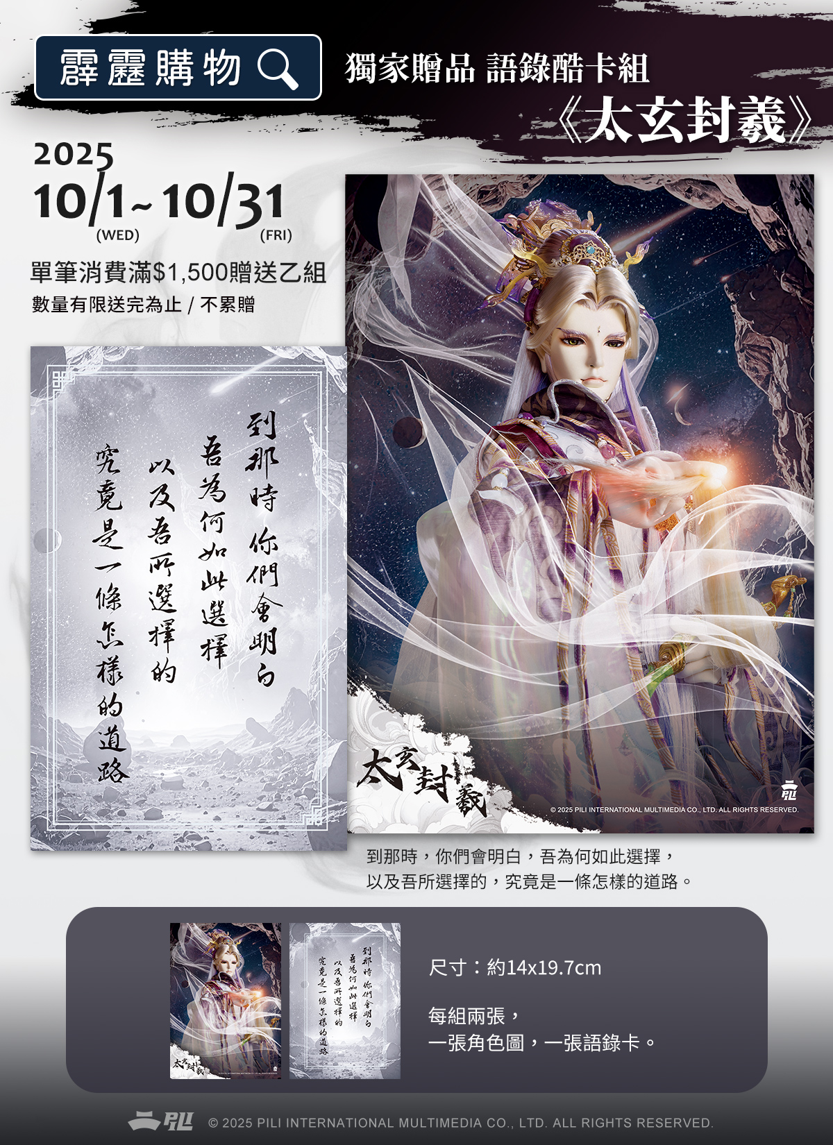 現貨商品單筆訂單消費滿1500元,贈送《語錄酷卡組-太玄封羲》乙組。(不累贈/數量有限送完為止)