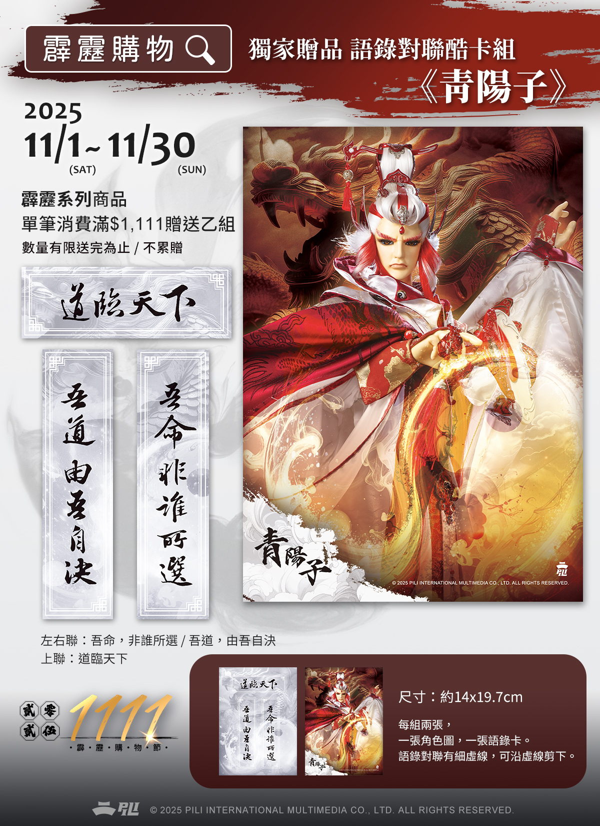 霹靂系列現貨商品單筆訂單消費滿1111元,贈送《語錄對聯酷卡組-青陽子》乙組。(不累贈/數量有限送完為止)