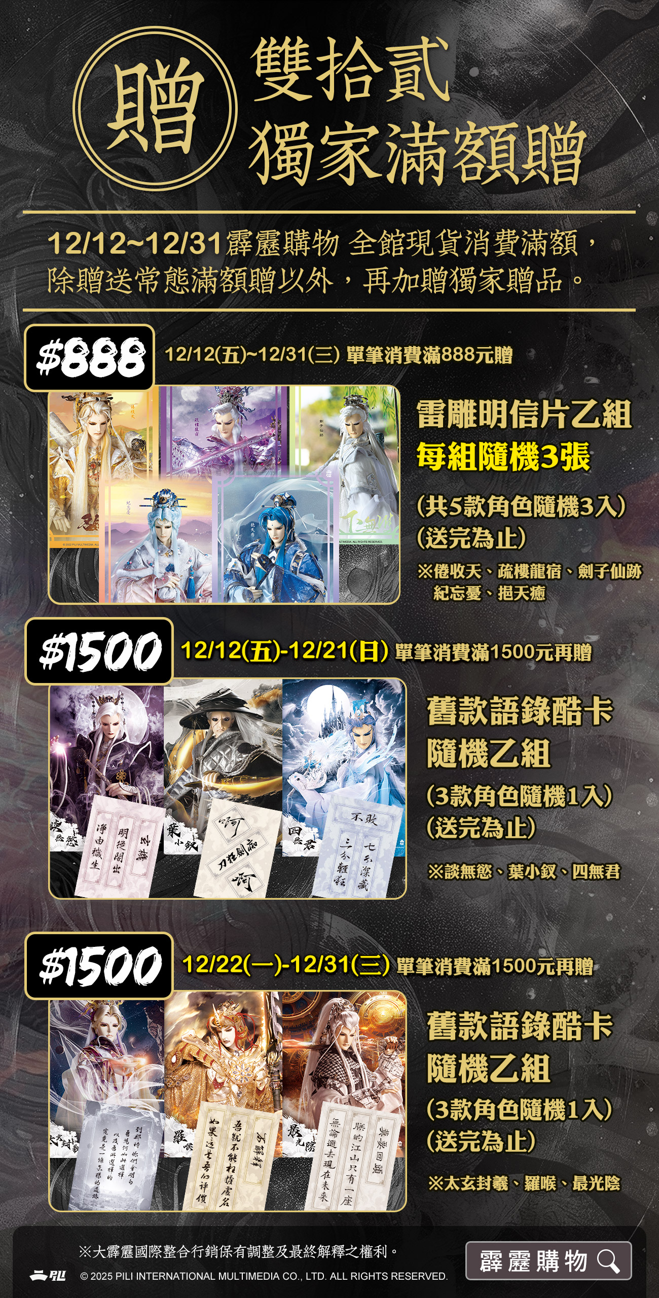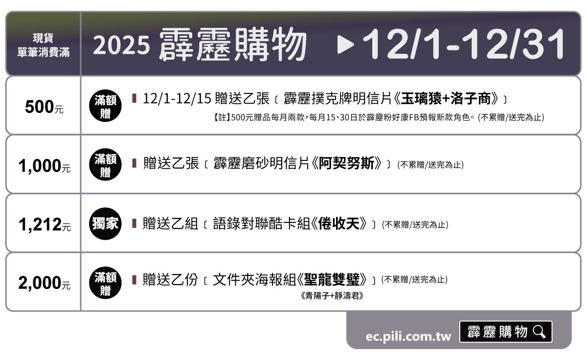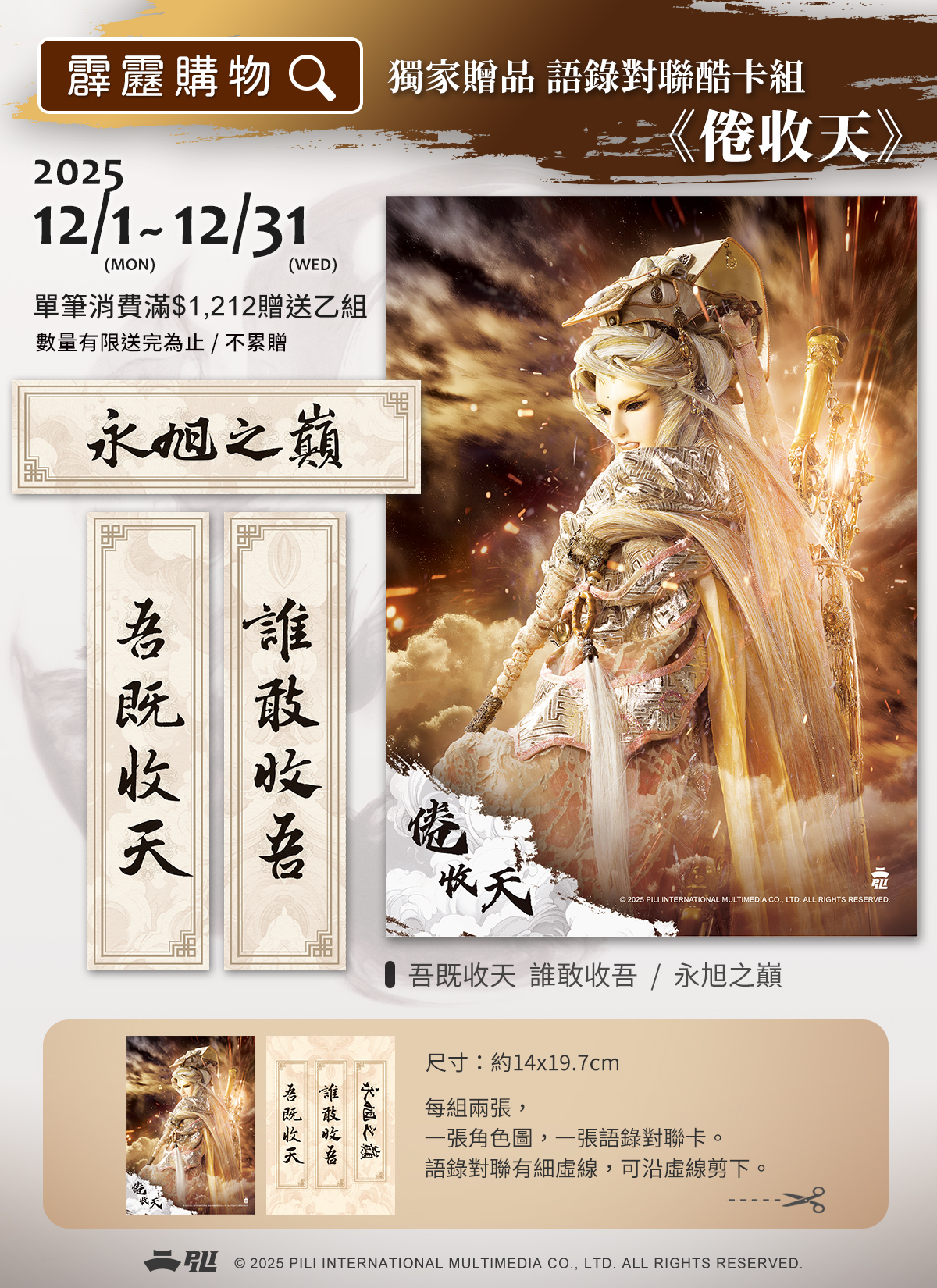 霹靂系列現貨商品單筆訂單消費滿1212元,贈送《語錄酷卡組-倦收天》乙組。(不累贈/數量有限送完為止)