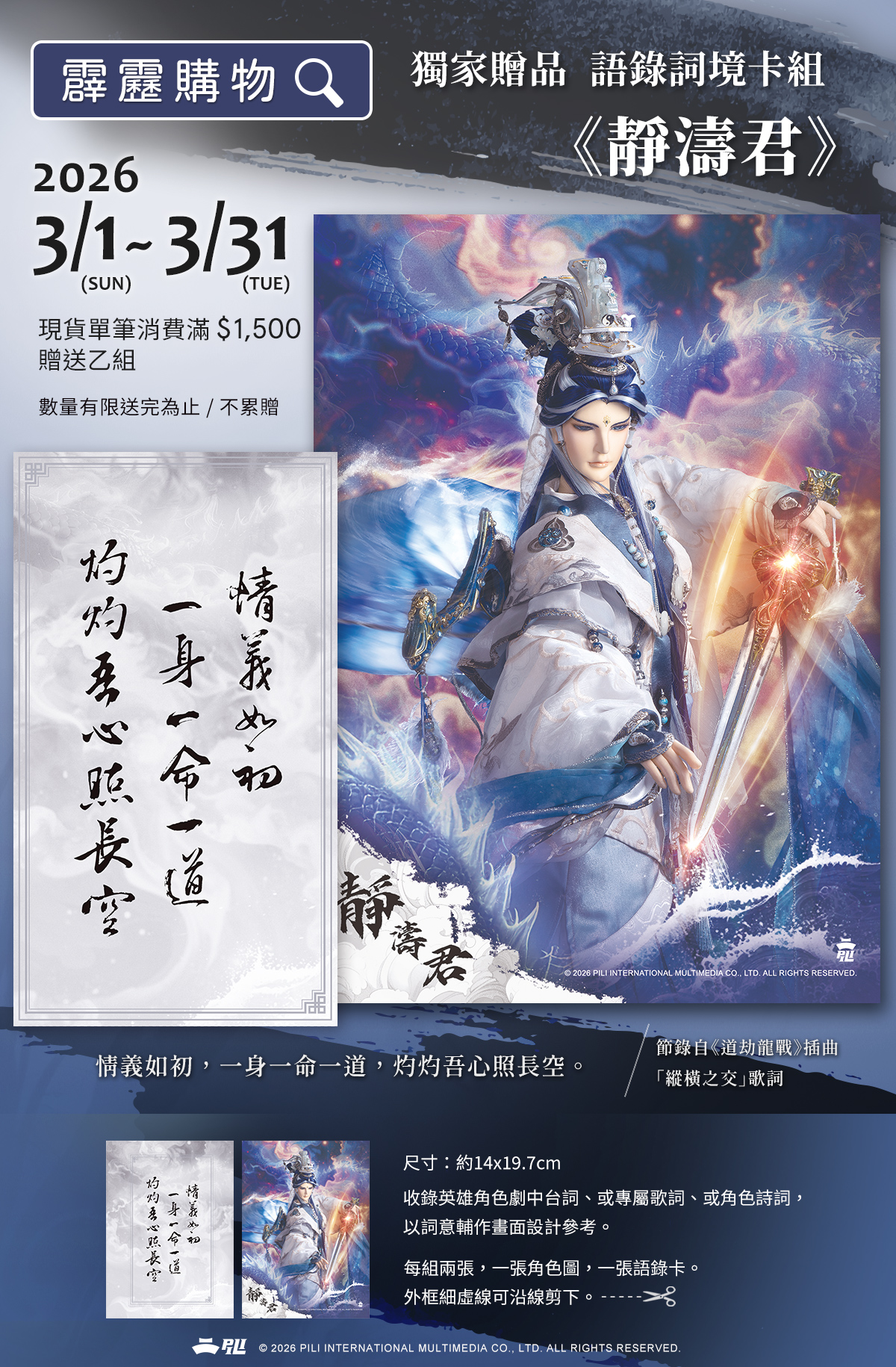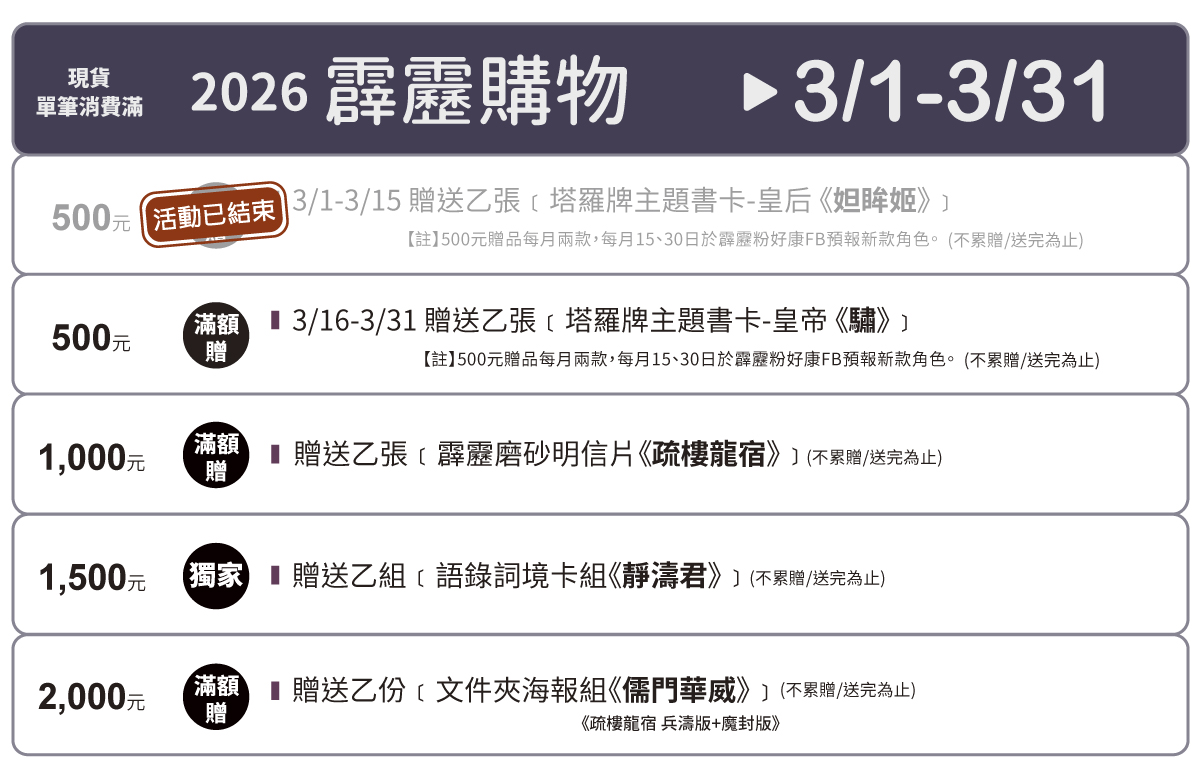 現貨商品單筆訂單消費滿1500元,贈送《語錄詞境卡組-靜濤君》乙組。(不累贈/數量有限送完為止)