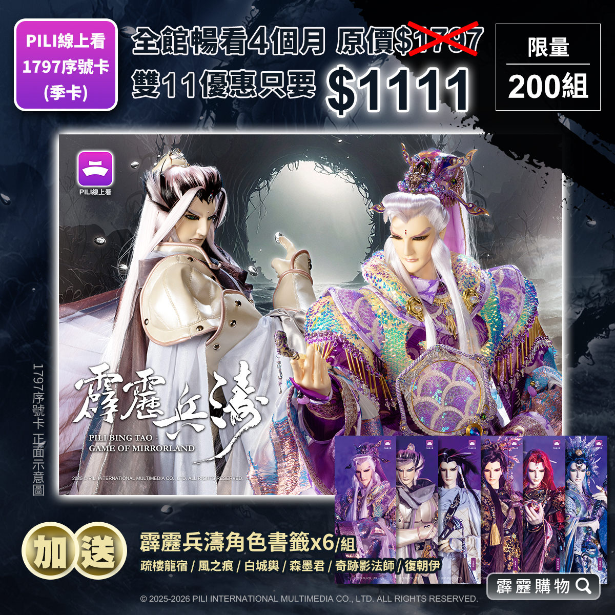 ※於霹靂購物購買PILI線上看影音序號卡,可再獲贈當月滿額贈。(依購物車單筆結帳金額計算)