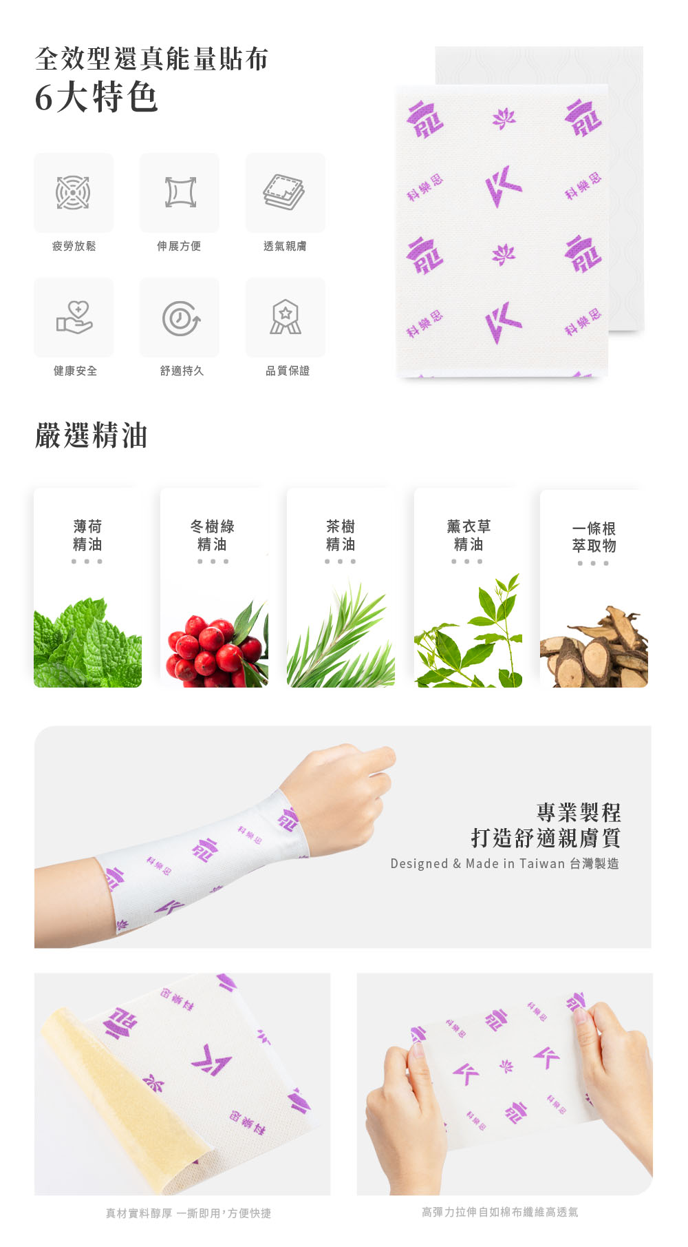成分:遠紅外線粉末、薄荷葉萃取物、一條根萃取物、冬綠樹精油、茶樹精油、薰衣草精油、樹脂、棉布。